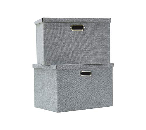 AlphaHome Extra Large Storage Box with Lid, Collapsible Linen Fabric Storage Baskets with Galvanized Metal Handles, Set of 2 (Glaucous Grey, 44x31x29cm)