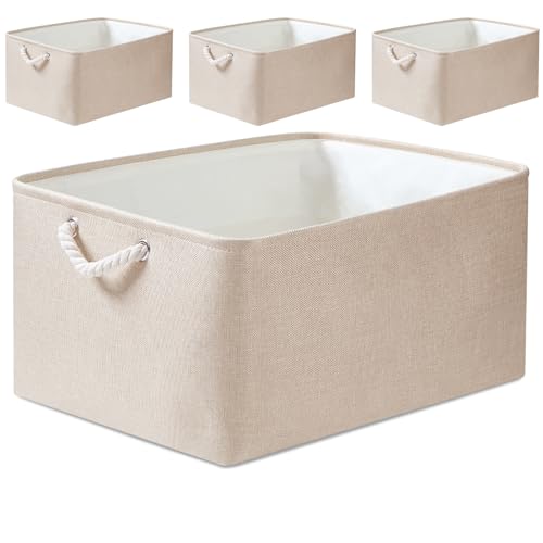 Mangata 4 Pack Linen Storage Boxes, Multi-Size, Rectangular Organiser Baskets for Shelves, Toys, and Clothes, 36x26x18cm(Light Khaki, Medium)