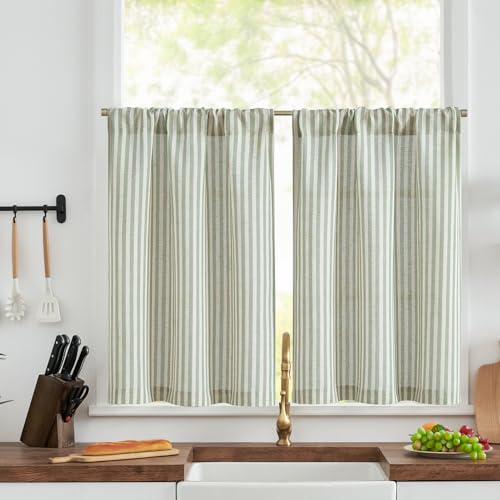 TOPICK Green Striped Linen Look Kitchen Curtains 30 Inch Drop, Rod Pocket Small Window Drapes for Living Room, Bathroom, Cupboard, Bedroom, Light Filtering Pinstripe Cafe Curtain 2 Panels, W26 x L30