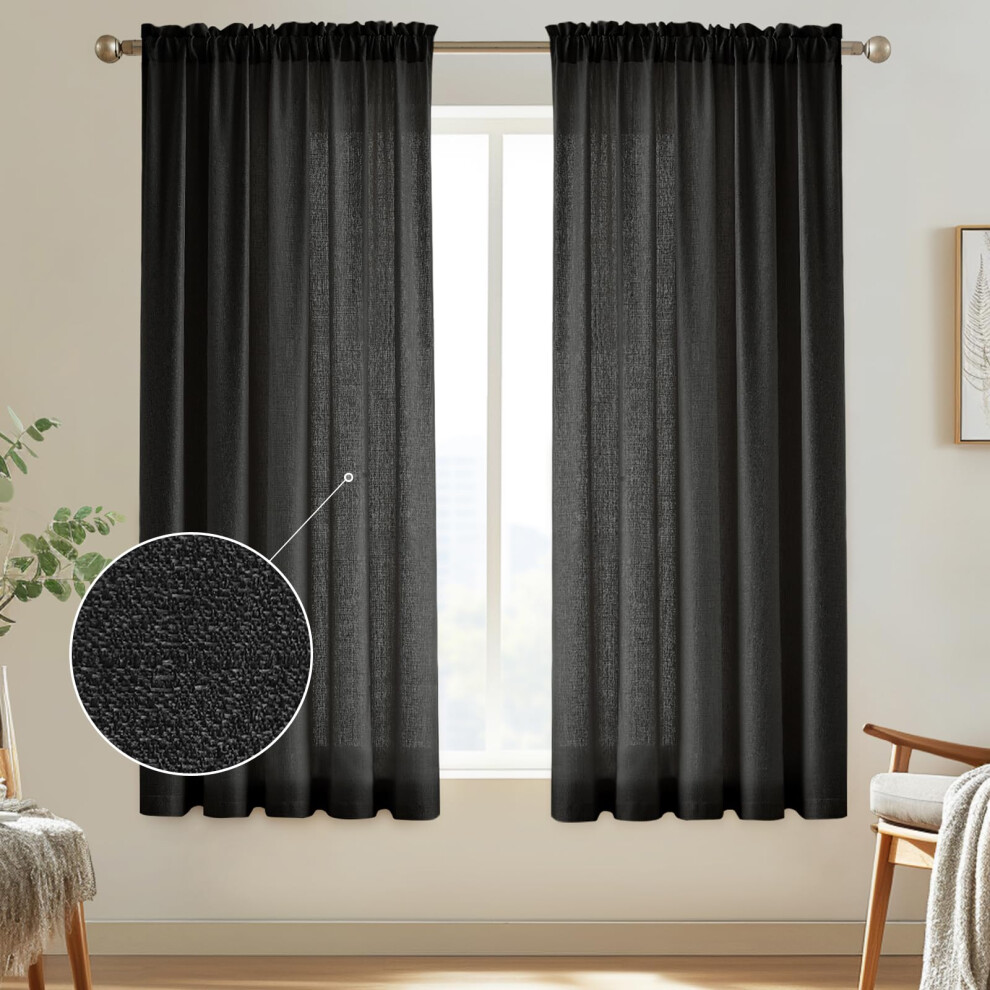 Melodieux Black Semi Sheer Curtains 72 Inches Long for Bedroom Living Room Linen Look Privacy Window Rod Pocket Sheer Drapes 52"""" W x 72""""