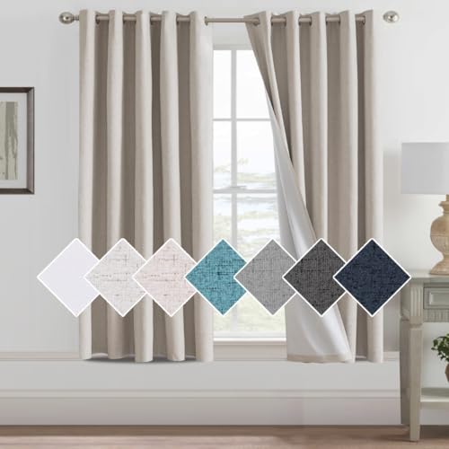 H.Versailtex Curtains for Living Room 100% Blackout Curtains Faux Linen with White Liner Grommet Eyelet Curtains Thermal Curtains for Bedroom, W46 x L54 Inch 2 Panels Set, Natural
