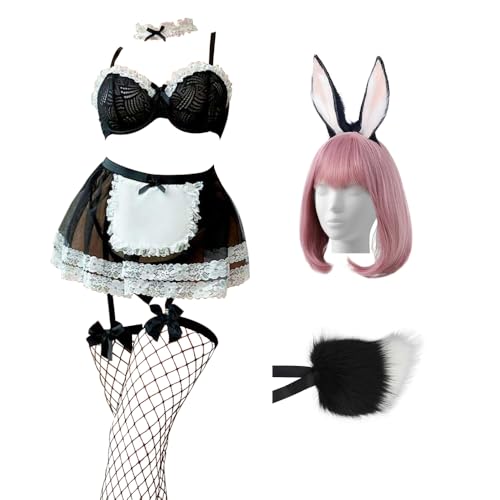 Women Maid Bunny Cosplay Set - Lace Lingerie Skirt, Fishnet Stockings, Bunny Ears Tail Wig for Anime Parties