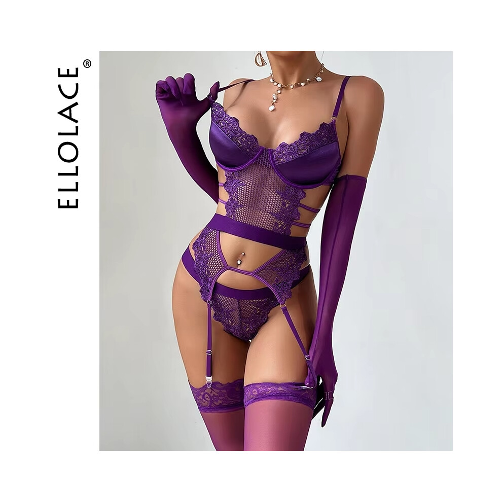 (L) Ellolace Purple Erotic Lingerie Complete Sexy Outfits Sissy G-String Thongs Lace Sex Costume Stockings Fantasy Adult Babydoll
