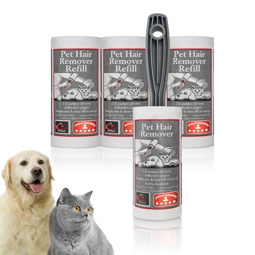 CARASELLE Pet Hair Remover (pack of 1 roller + 3 refills) Roller packed with Refills bundle - 7.5 metres of Super Adhesive sheets - Picks up Lint, Hair & Debris on Furniture Carpet Bed & any surface