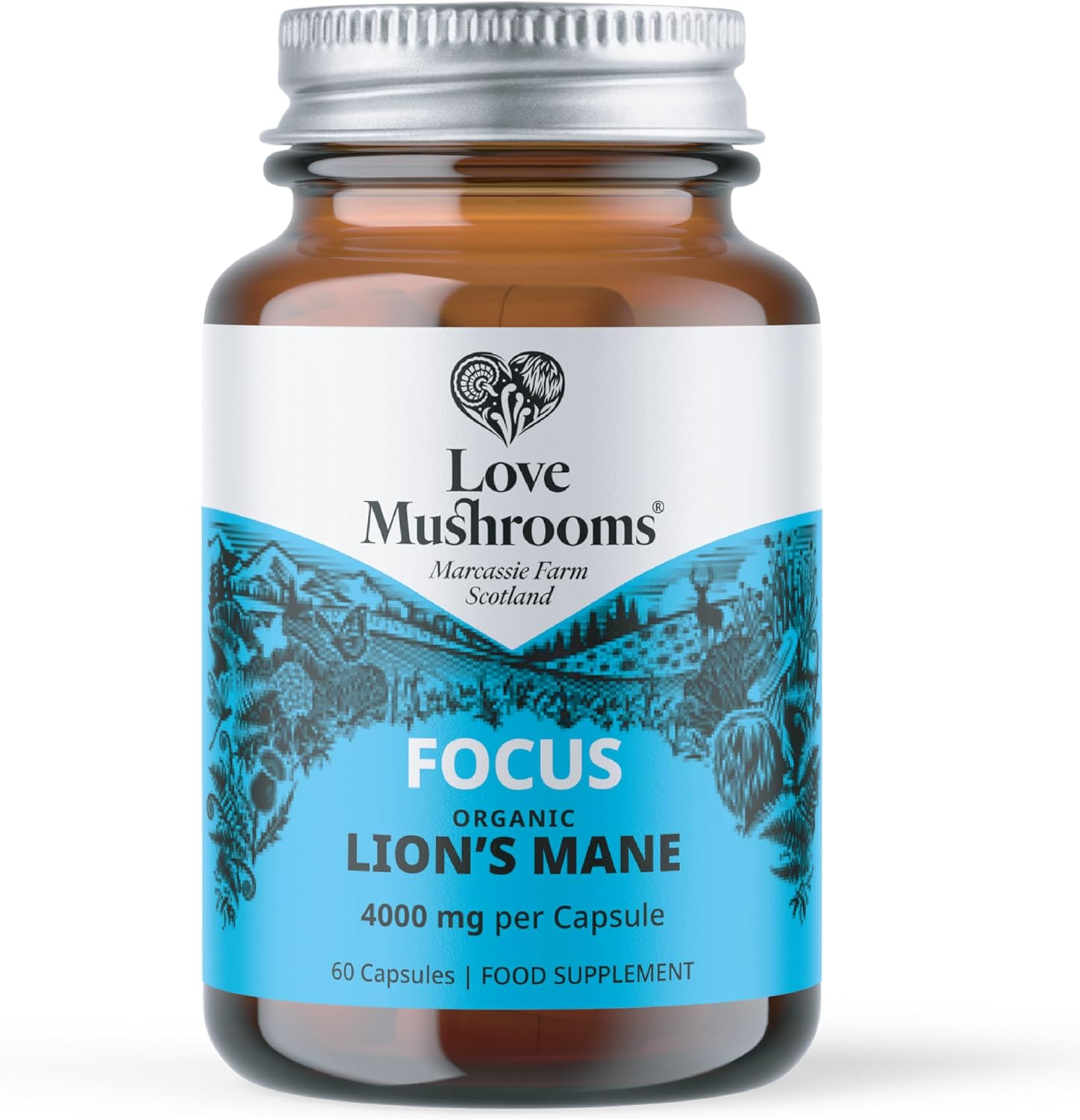 Love Mushrooms - Organic Lion's Mane Capsules - Deep Focus - 4000mg Capsule - Lions Mane Supplement for Memory and Focus Support - Vegan and Made in The UK - 30