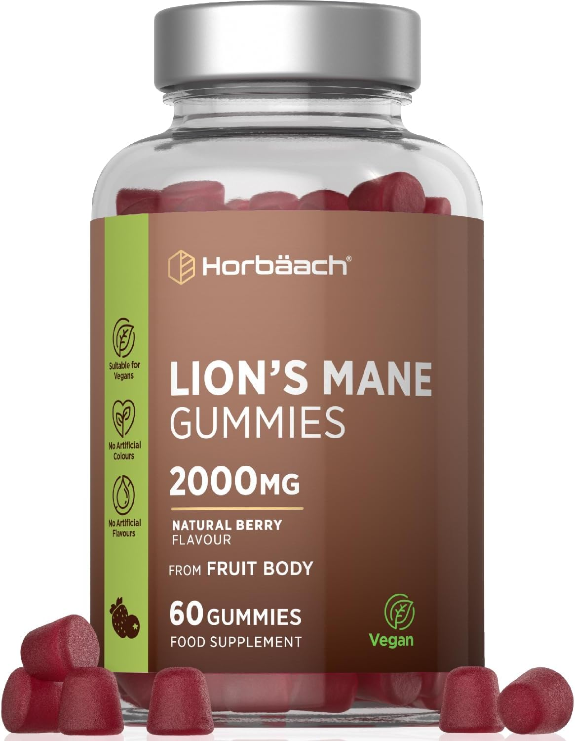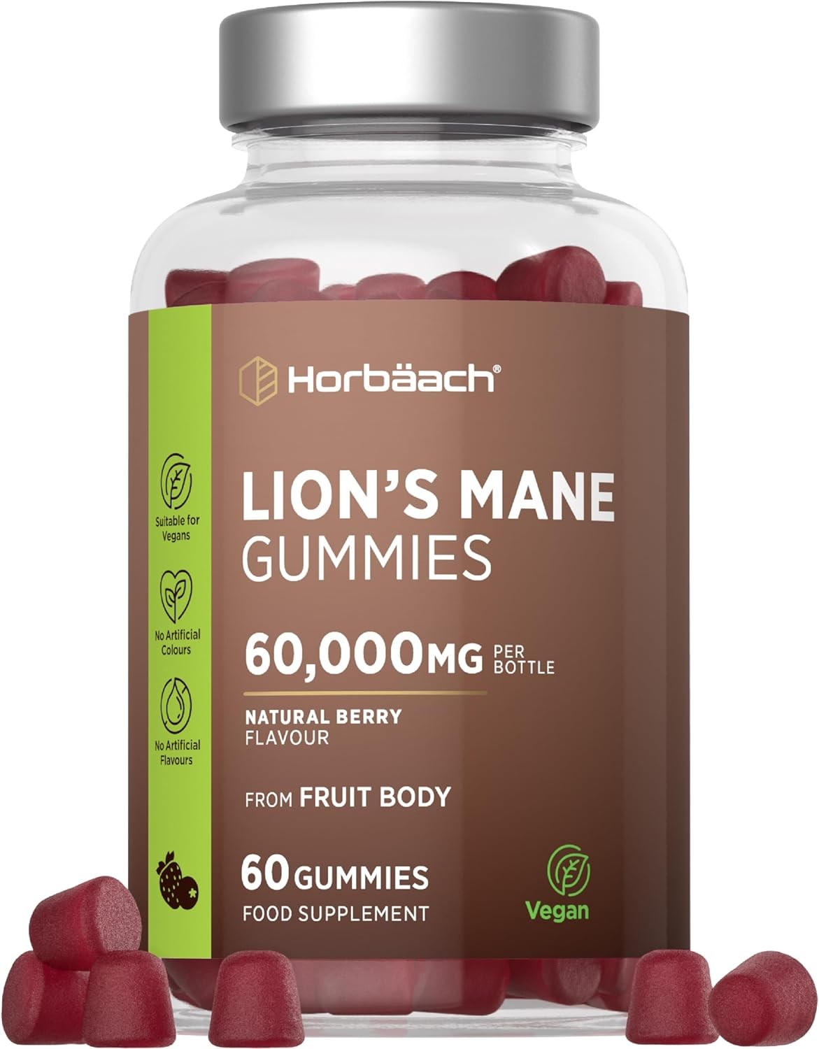 Lions Mane Gummies 60,000mg per Bottle | High Strength Lions Mane Supplement | Mushroom Extract | Natural Berry Flavour | 60 Vegan Gummies | by Horbaach