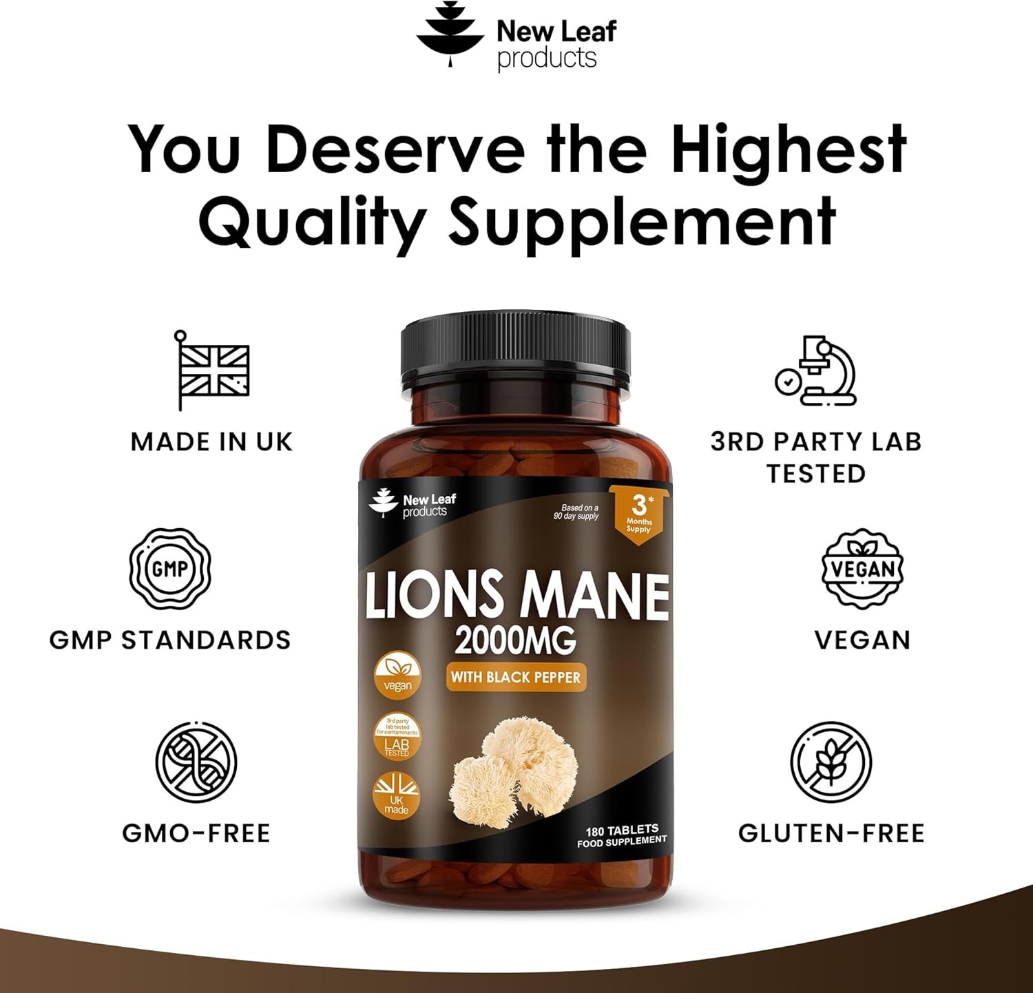 Lions Mane Mushroom 2000mg - 180 High Strength Vegan Tablets - Lion's Supplement with Black Pepper - Mushrooms Extract (Not Powder or Capsules) Made in The UK by New Leaf products