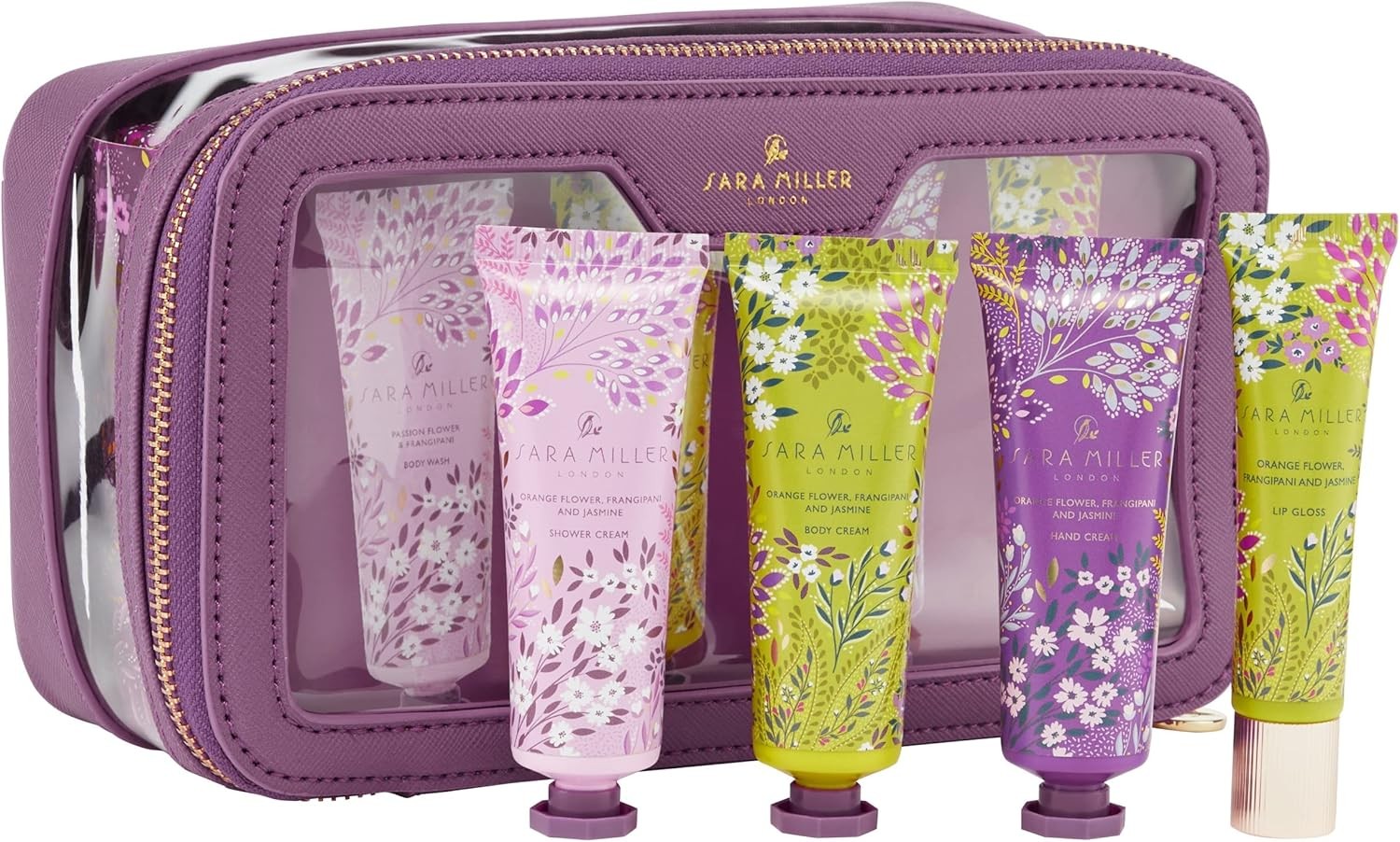Sara Miller London Hand Cream, Body Wash and Cream x3 30ml, Lip Gloss 15ml, Passion Flower and Frangipani Scented, Moisturiser, Travel Bag Set, Vegan and Cruelty Friendly, Gift For Her