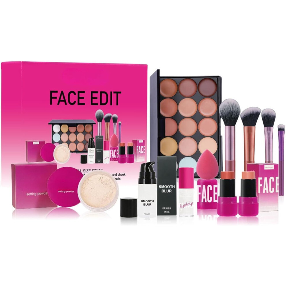 All in One Makeup Set, 15 Colors Concealer Palette, Face Setting Powder, Primer makeup Lotion,Glitter Shine Lipstick, Puff Oval Brush, 4Pcs Brush