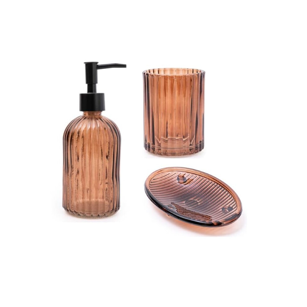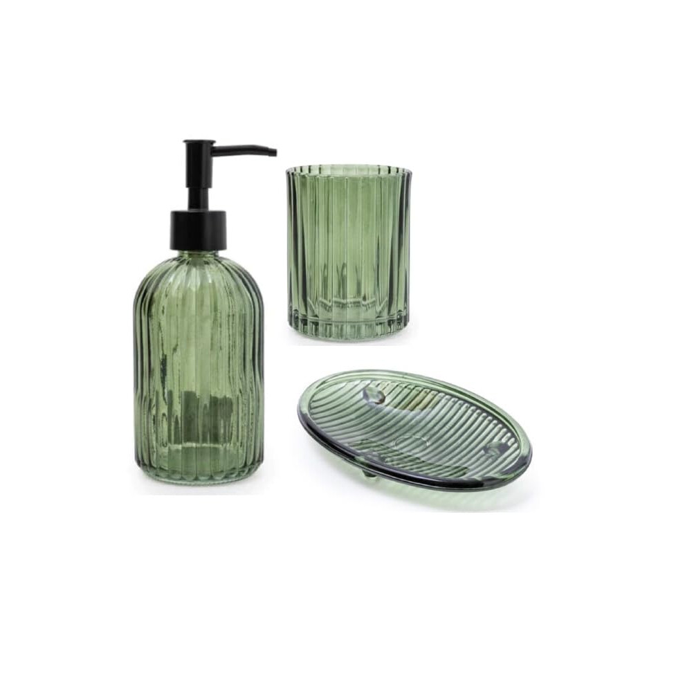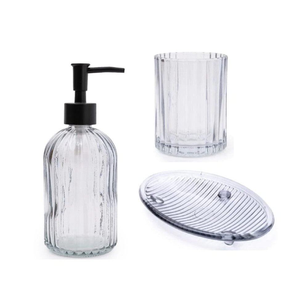Home Deco London Set of 3 Modern Transparent Pressed Glass Bathroom Accessory Set, Includes Liquid Soap or Lotion Dispenser, Toothbrush Holder, Soap