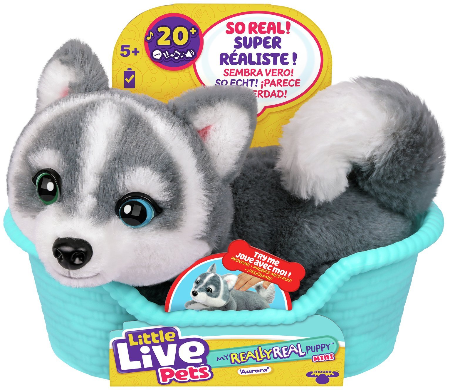 Little Live Pets My Really Real Puppy Minis- Aurora the Husky| Interactive Puppy with 20+ Sounds & Reactions- Includes Basket for Display. Fun & Adorable Gift for Kids (11cm/4.3in tall)