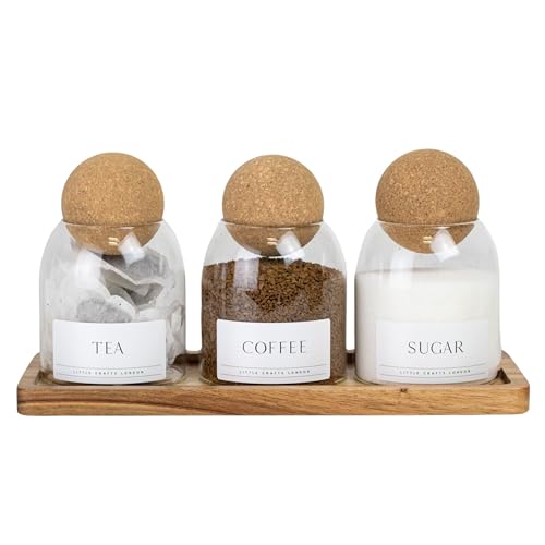 Little Crafts London Tea Coffee Sugar Canisters Set of 3 Cork Ball Glass Jars 500 ML with Acacia Rectangle Tray