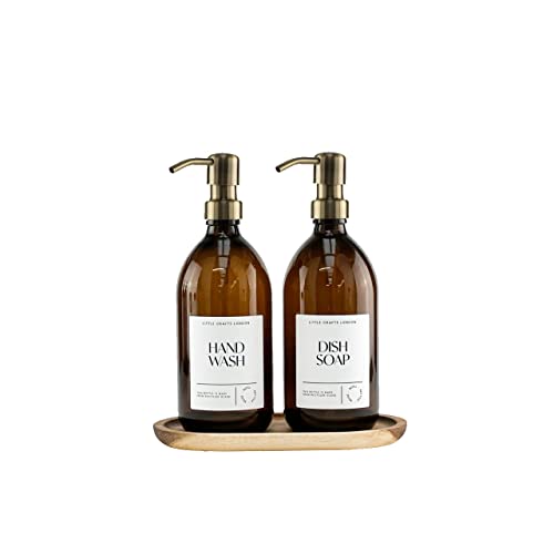 Little Crafts London - Set Of 2 Amber Glass Bottle 500 ML With Stainless Steel Pump & Oval Acacia Tray - Hand Wash & Dish Soap (Bronze 1)