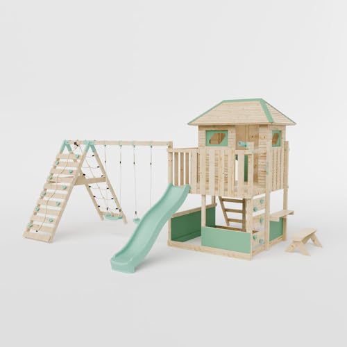 Waltons Wooden Outdoor Kids LittleSummit Large Tower Playhouse with Swing & Climbing Wall & Toddler-Friendly Features | Pressure-Treated Timber Garden Playset for Children | Handmade in the UK