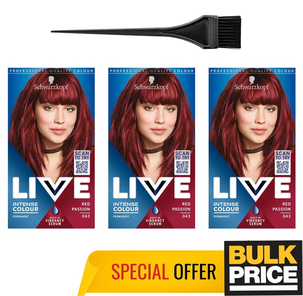 Schwarzkopf LIVE 043 Red Passion Intense Color Permanent Hair Dye Bulk 3-Pack