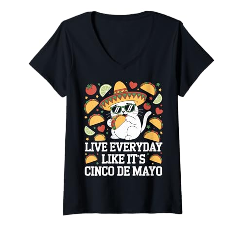 Women's Live Everyday Like It's Cinco de Mayo cat Eating a Taco V-Neck T-Shirt