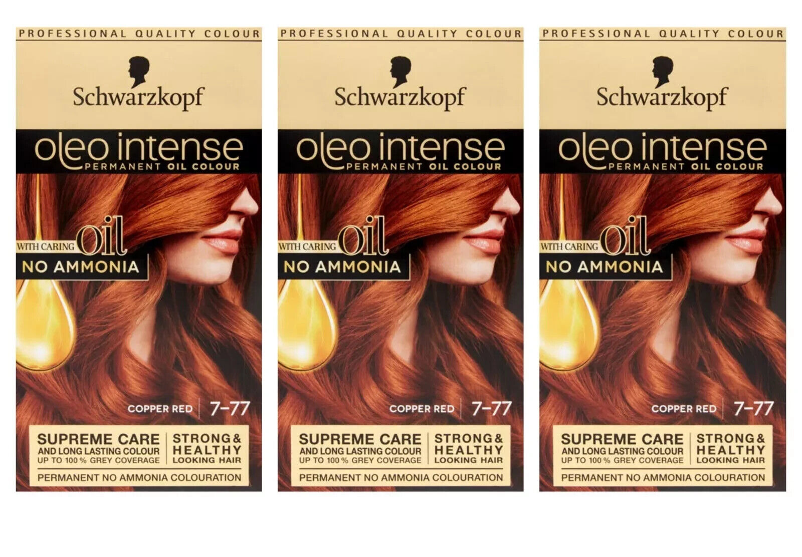 3 x Schwarzkopf Oleo Intense Permanent Hair Dye Colour 7-77 Copper Red