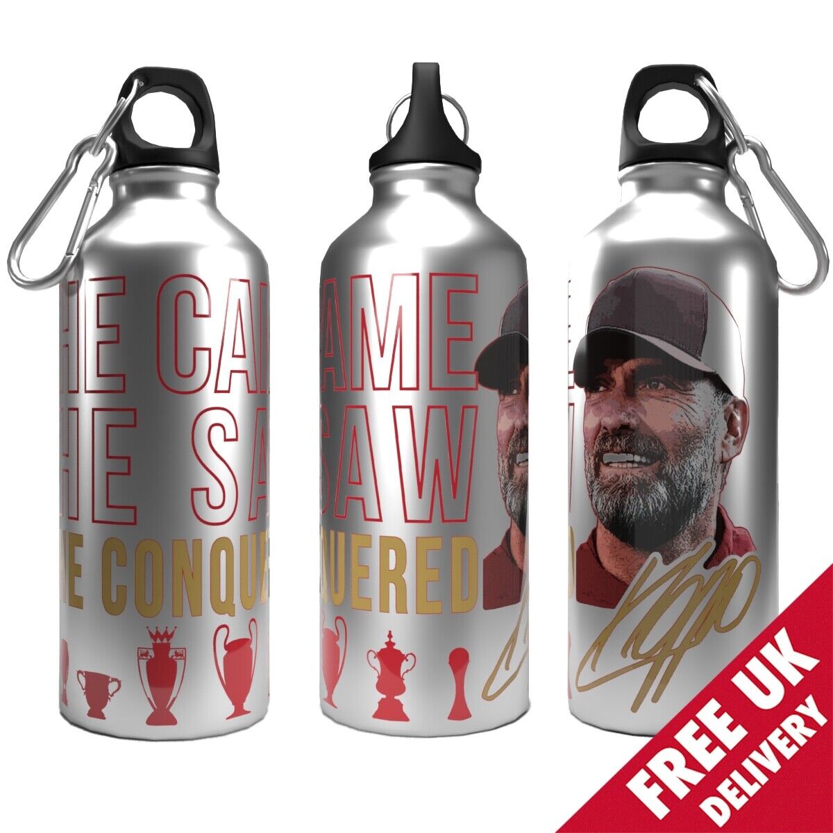 Liverpool Klopp Conquered Water Bottle 750ml Aluminium | 2 Lids + Carabiner
