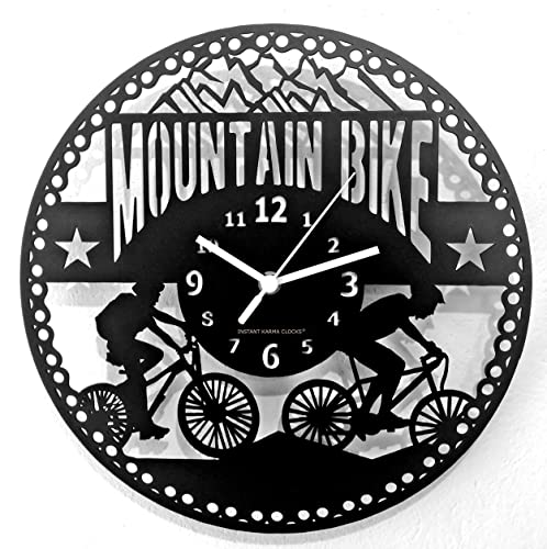 Instant Karma Clocks | Mountain Bike Wall Clock with Cyclists and Cycling Bicycle Design | Silent No-Ticking | Perfect for Bedroom, Office, Studio, Cabin, Living Room | Unique Decoration
