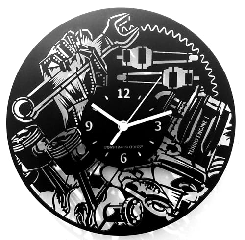 Instant Karma Clocks | Mechanic Wall Clock – Engine Pistons and Tools Design for Garage and Auto Repair Lovers – Silent No-Ticking | Perfect for Bedroom, Office, Studio, Living Room