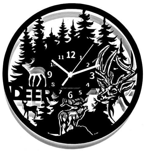 Instant Karma Clocks | Deer Wall Clock with Forest and Stag Silhouette | Silent No-Ticking | Perfect for Bedroom, Office, Studio, Cabin, Living Room | Unique Decoration