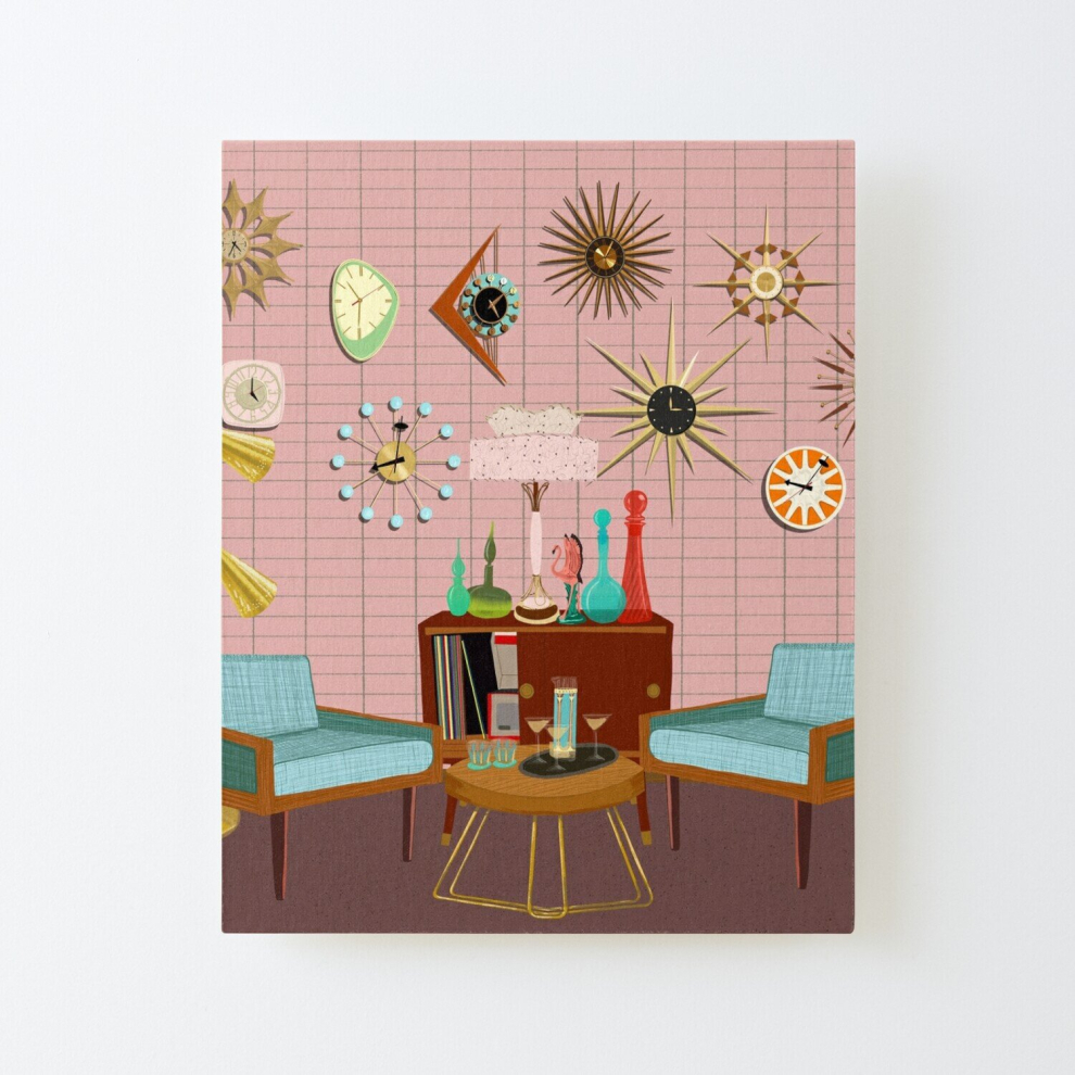 Canvas Print Only Mid Century Living Room with Clock Collection Poster Wall Art Room Decor 16x20 inch No Frame