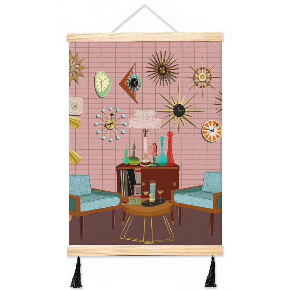 (Mid Century Living Room With Clock Collection_9562) Canvas Poster Hanging Kit Frame 16x20 Inch Wall Hanger with Tassels Art Home Decor Funny for Clas