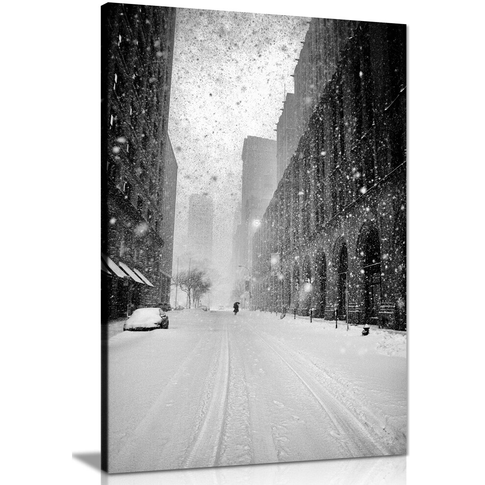 Panther Print Fine Art Prints Black & White New York street in Snow Blizzard Artistic Framed Canvas Print, Pictures for Home Walls, Bedroom, Living