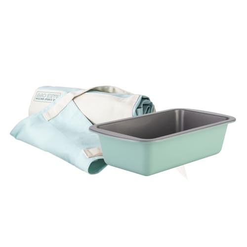 The Great British Bake Off Baking Gifts, inc. Official Bake Off Apron for Women & Men, Loaf Tin, Carbon Steel Bakeware & 100% Cotton Textiles in Signature Duck Egg Blue, GBBO Logos on Both pcs