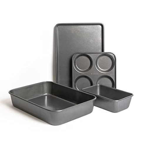 Store & Order Baking/Roasting Starter Set - Large 38.5cm Non-Stick Oven Tray, 4 Cup Yorkshire Pudding Tray, 25cm Square Sandwich/Cake Tin and 25cm Deep Loaf Tin, Nestable Bakeware & Dishwasher Safe