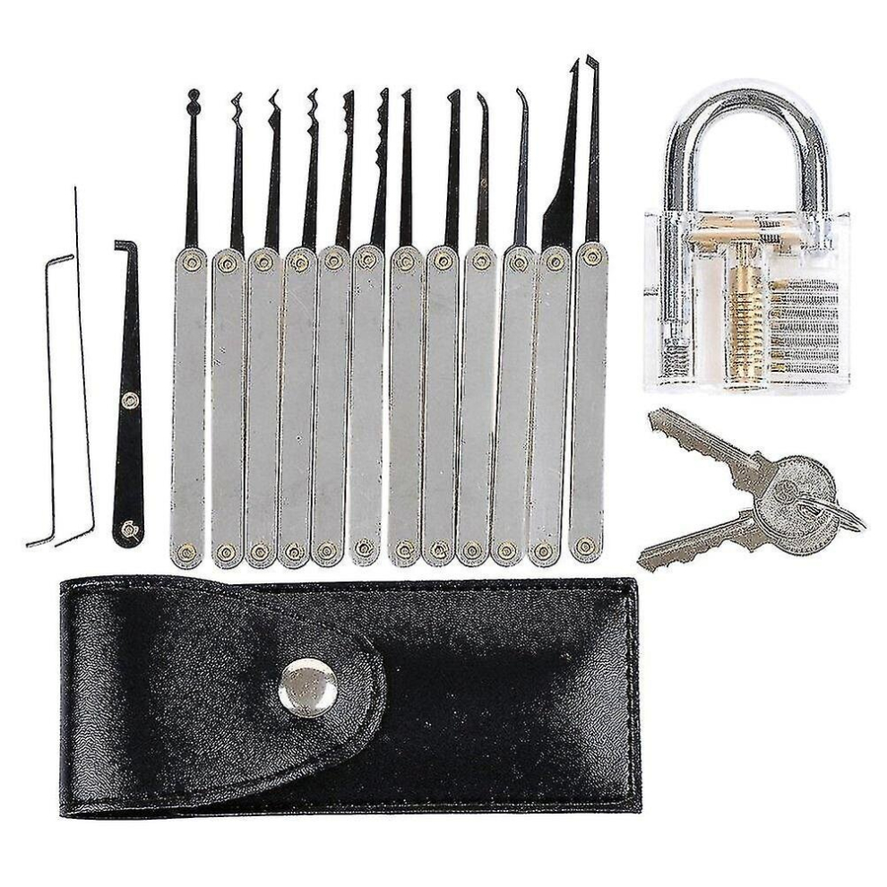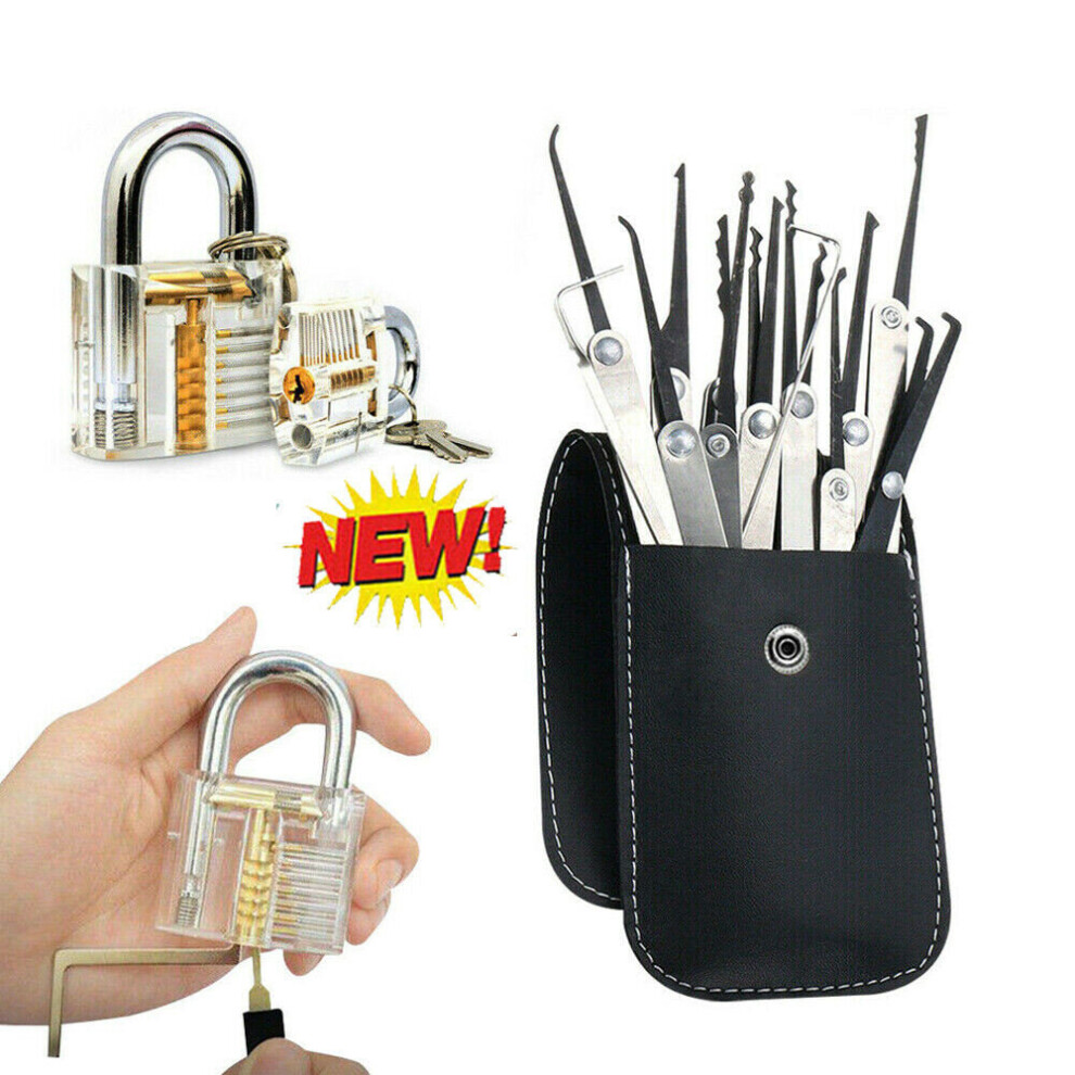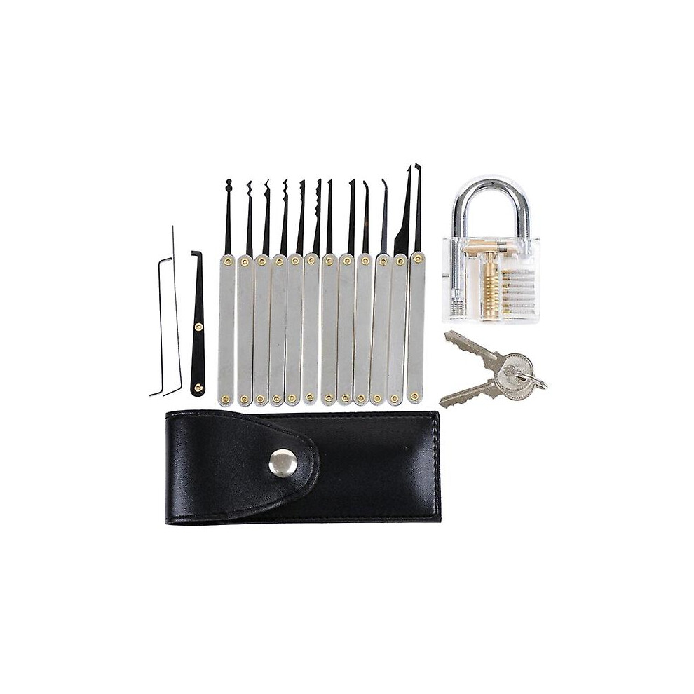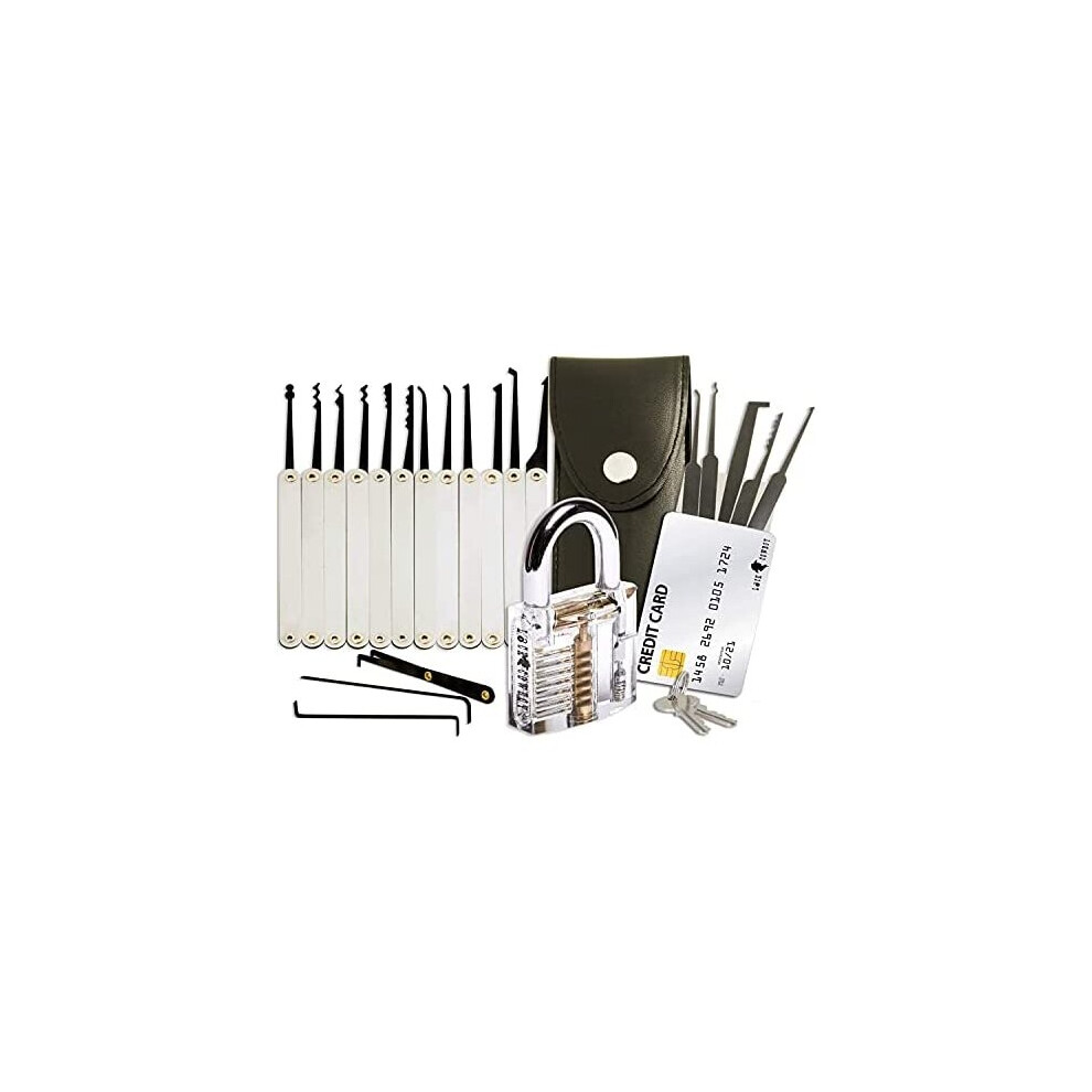 19-Piece Transparent Padlock Practice Set - Lock Pick Training Kit with 15 Picks, 1 Transparent Lock, 2 Keys & Leather Case