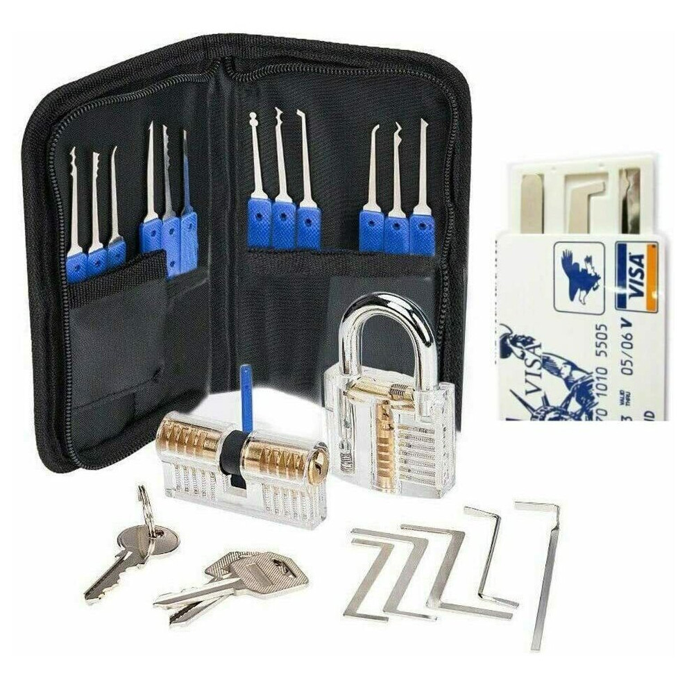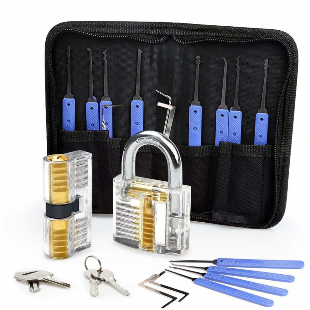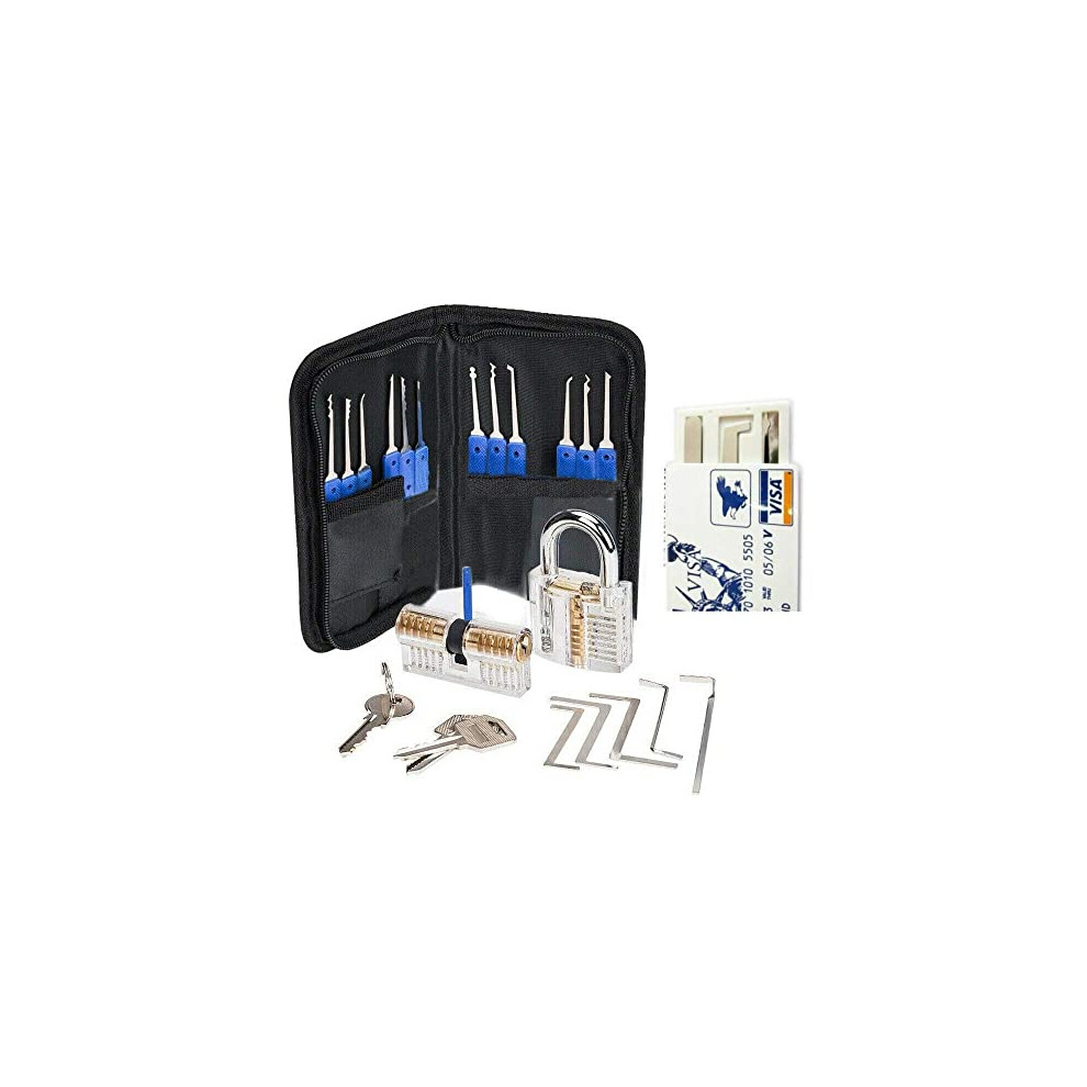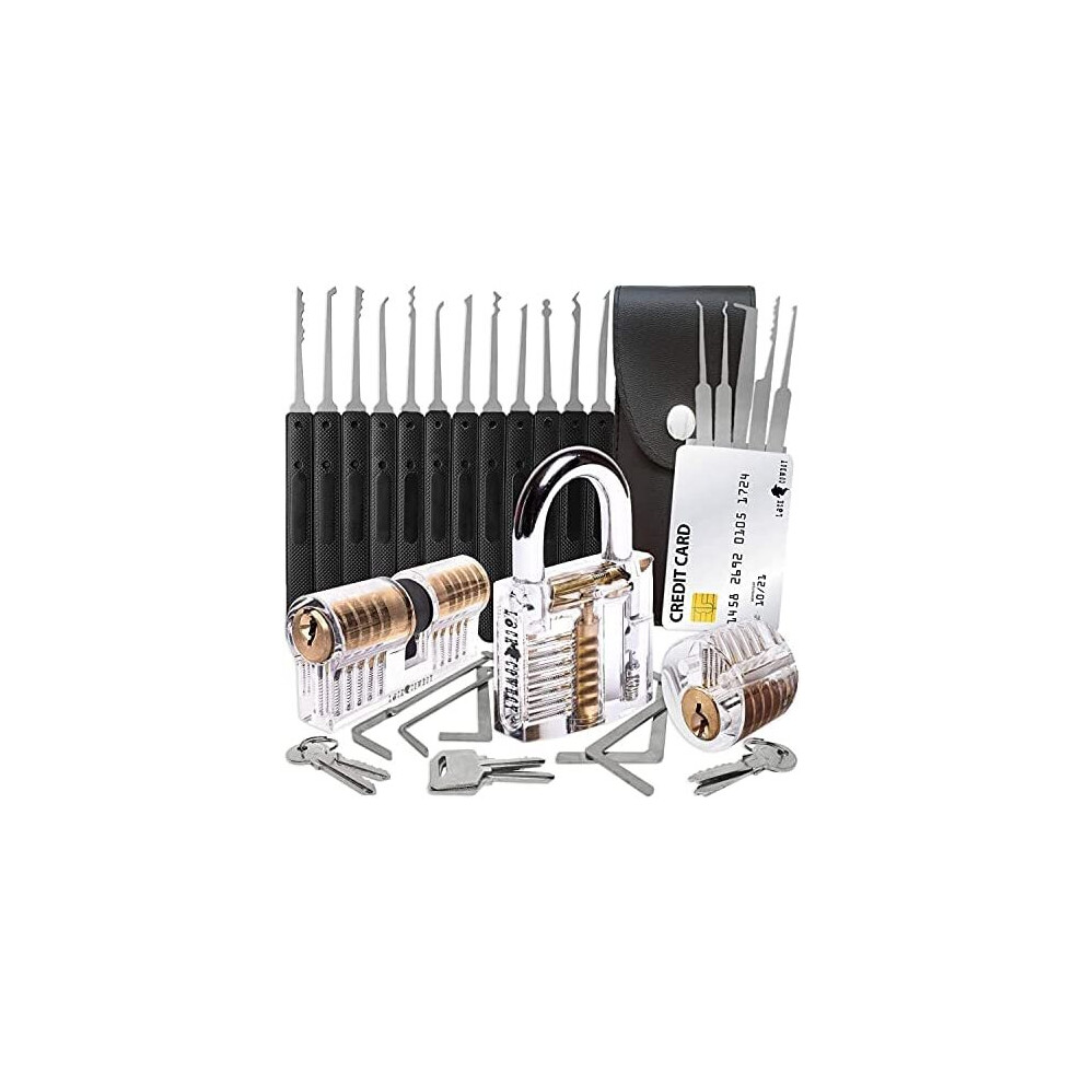 19-Piece Transparent Padlock Practice Set - Lock Pick Training Kit with 15 Picks, 1 Transparent Lock, 2 Keys & Leather Case