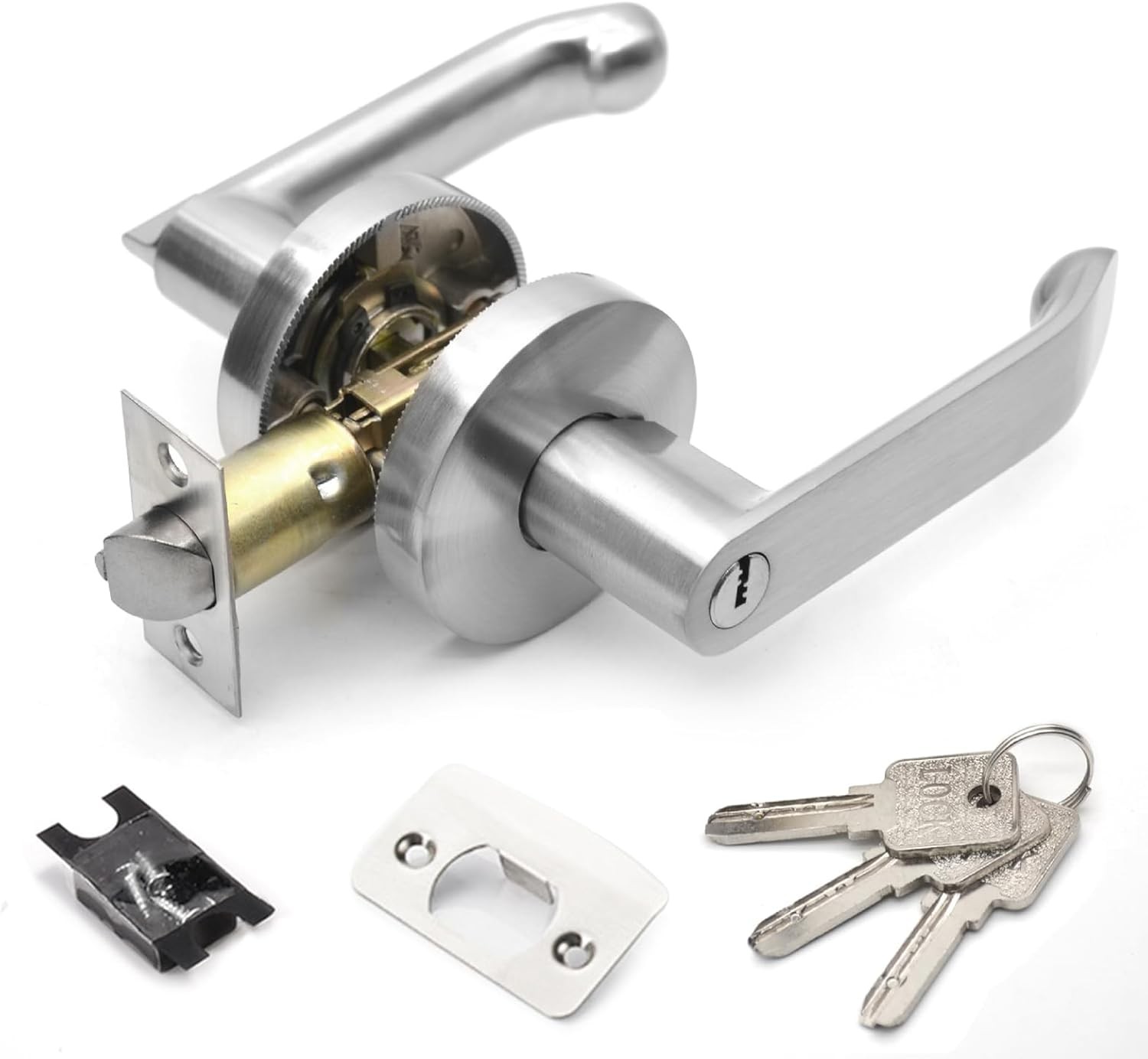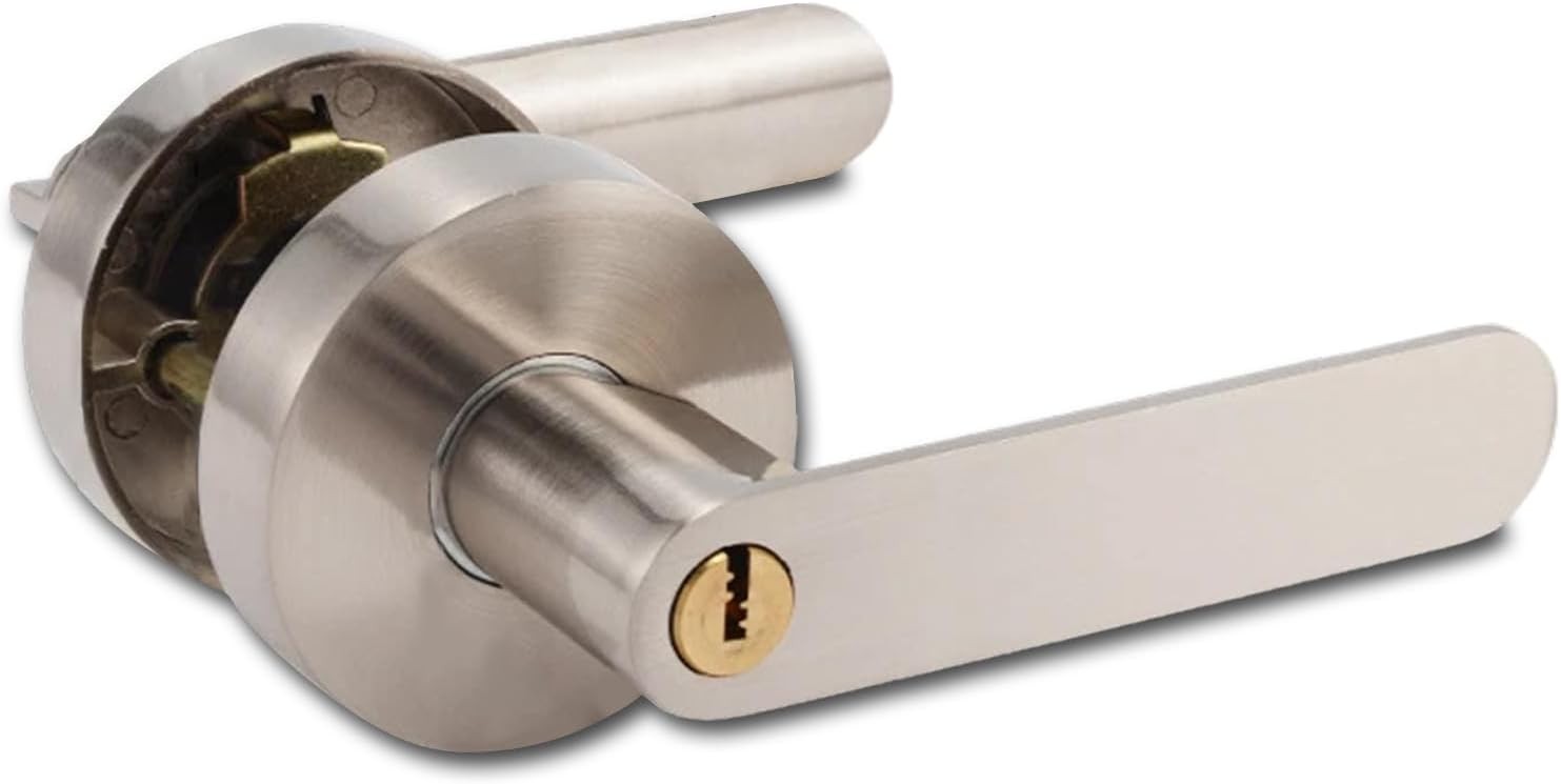 Quixenta Lever Door Handle Lock with Keys, Satin Nickel Door Handle Lock, Door Lock for Interior, Bedroom Door Lock, Privacy Knob Locking Device, Security Door Locks for Entrance/Exit Access