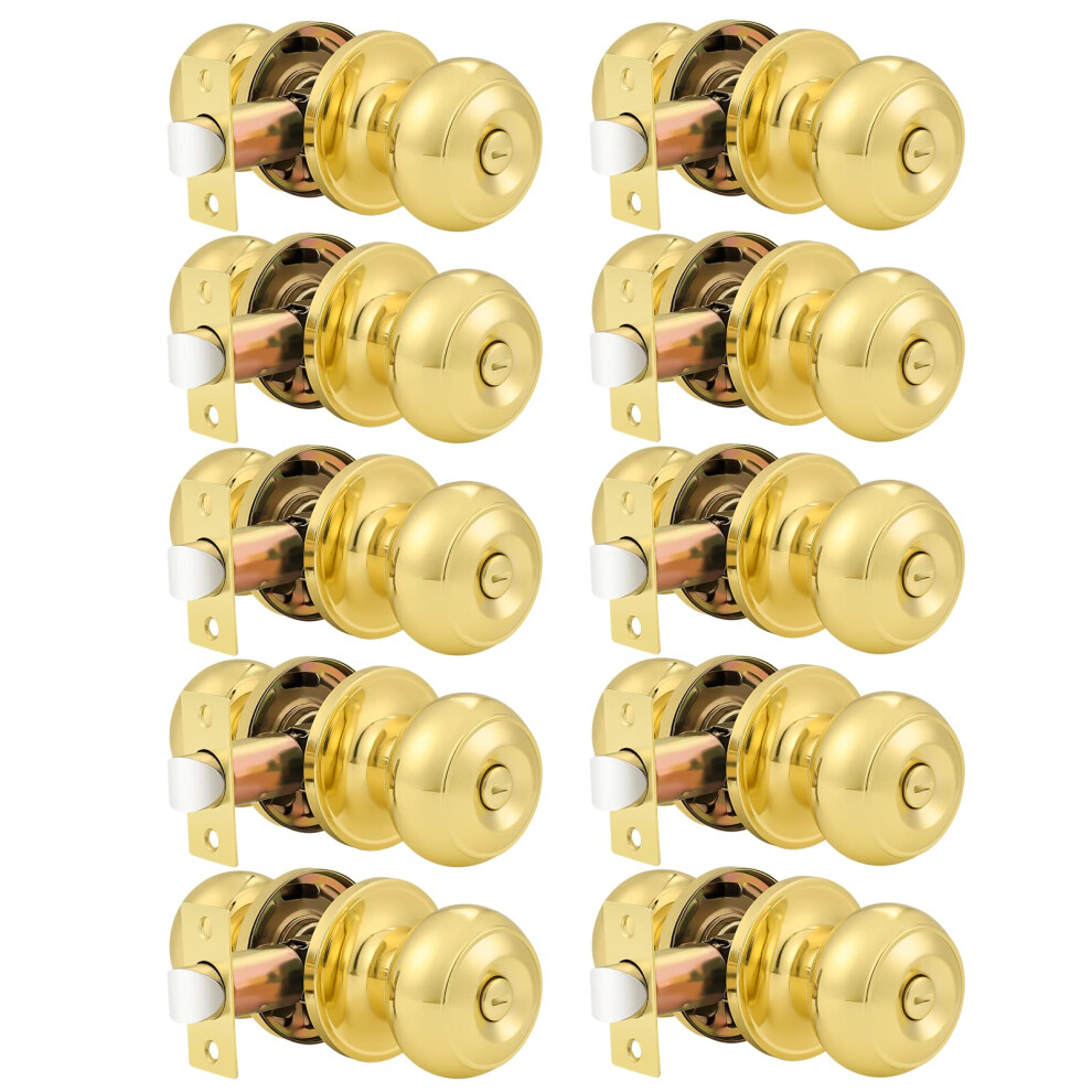 Probrico 10 Pack Privacy Door Knobs Lock Interior Bedroom Bathroom Door Handle Polished Brass Round Ball Keyless Lockset