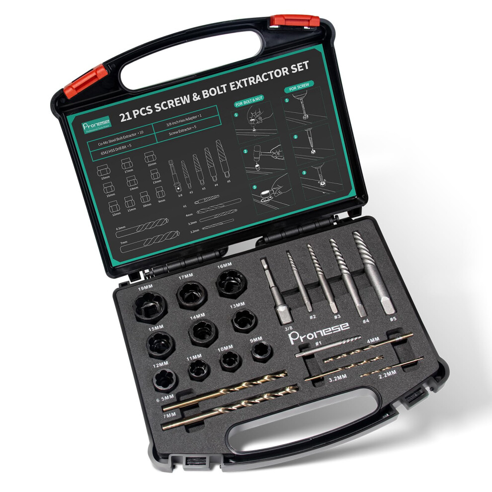 Pronese 21 pcs Bolt&Screw Extractor and Drill Bit Set, Damaged Screw Extractor Set, Bolt Nut Remover and Locking Wheel Nut Removal Tool, Easy Out