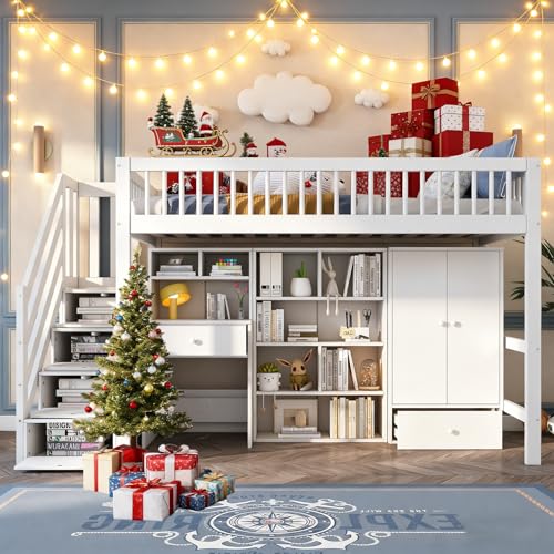 Multifunctional Loft Bed with Desk and Stair Storage, Solid Wood and MDF Construction with Bookshelves, Drawers, Wardrobe, Safety Rails, Interchangeable Staircase,Study Area