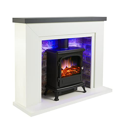 Endeavour fires Farlington Electric Fireplace, Black Log Burner Stove in 48'' Off White Surround, LED Downlights with Remote Control (Grey Top/Grey Brick)