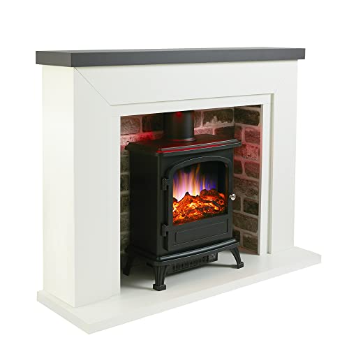 Endeavour Fires Farlington Electric Fireplace, Black Log Burner Stove in 48’’ Off White Surround, LED Downlights with Remote Control (Grey Top/Rustic Brick)