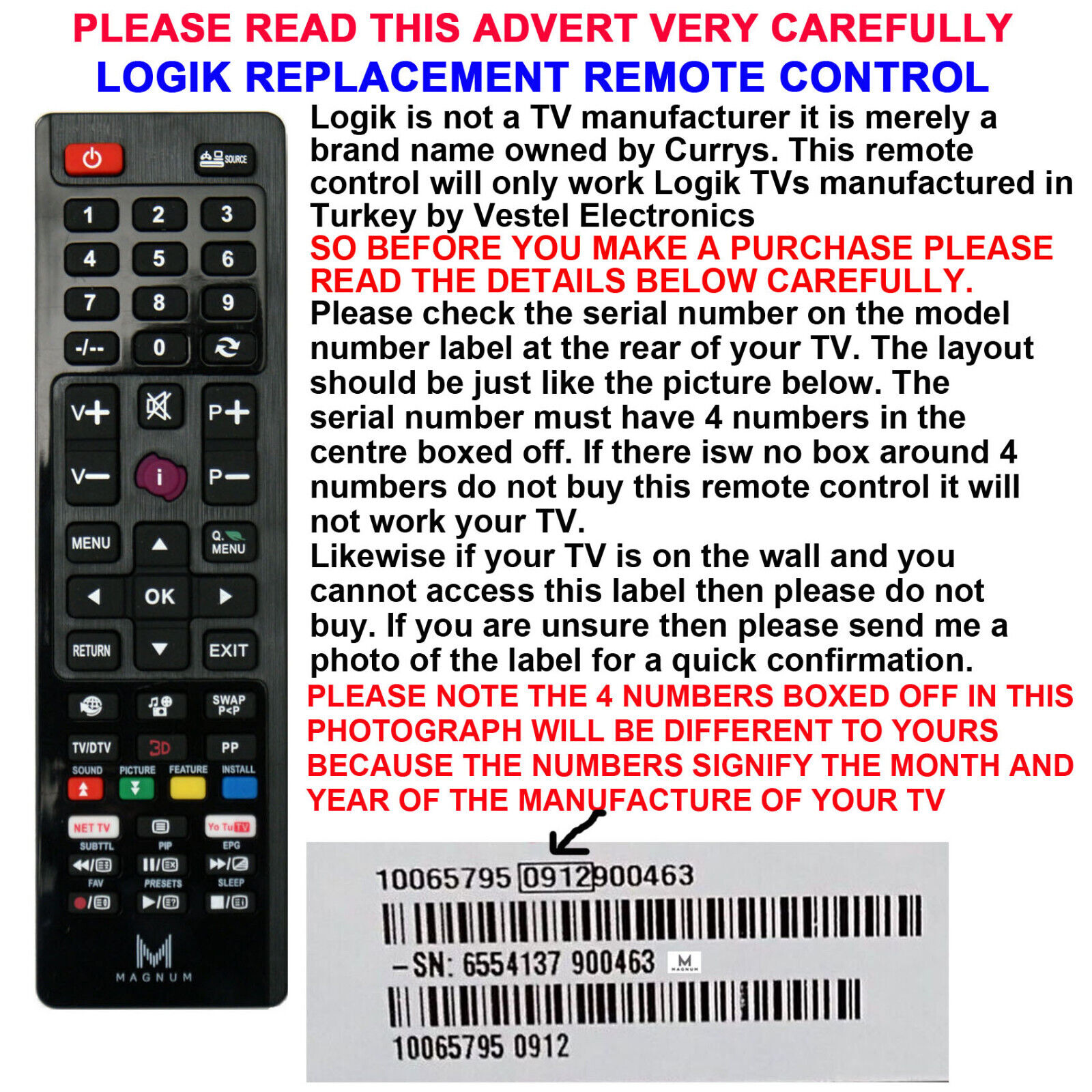 New Replacement For Logik TV Remote Control For L5SSTB13 UK STOCK