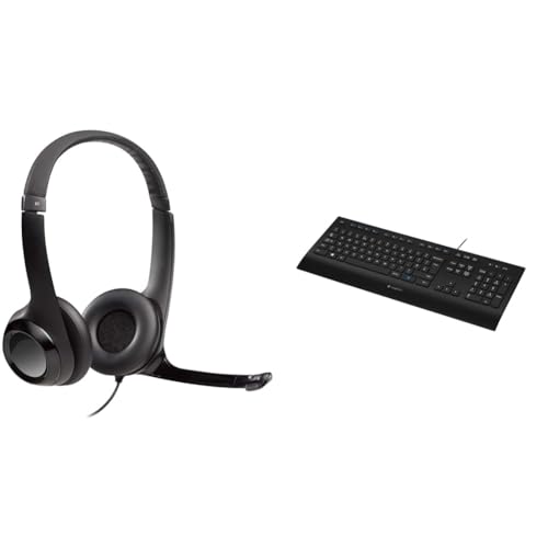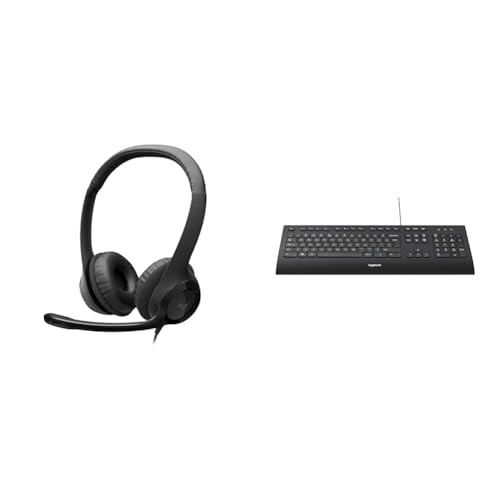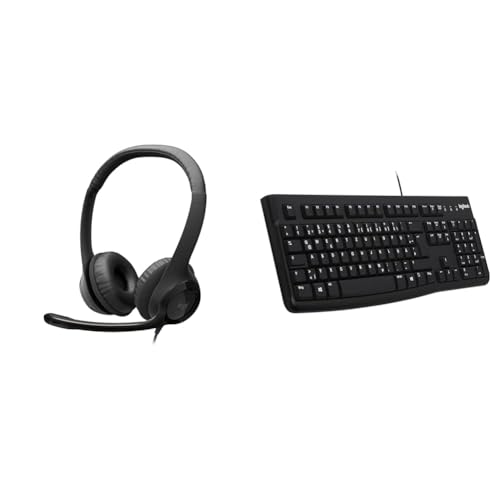 Logitech H390 Wired Headset for PC/Laptop, Stereo Headphones with Noise Cancelling Microphone & K120 Wired Keyboard for Windows, QWERTZ German Layout - Black