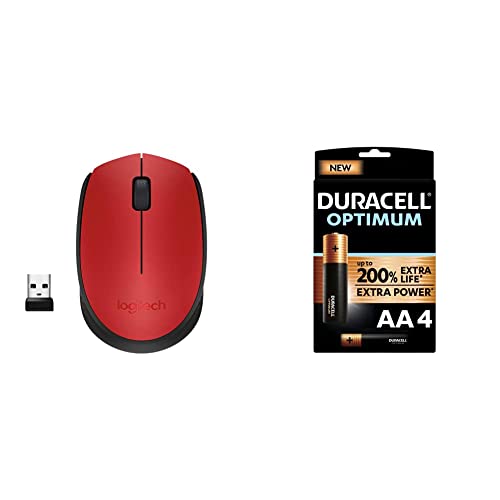 Logitech M171 Wireless Mouse, 2.4 GHz with USB Mini Receiver - Red + Duracell NEW Optimum AA Alkaline Batteries [Pack of 4]