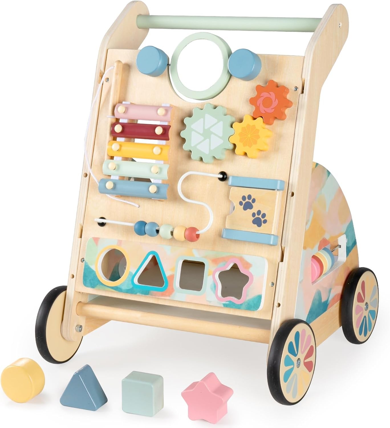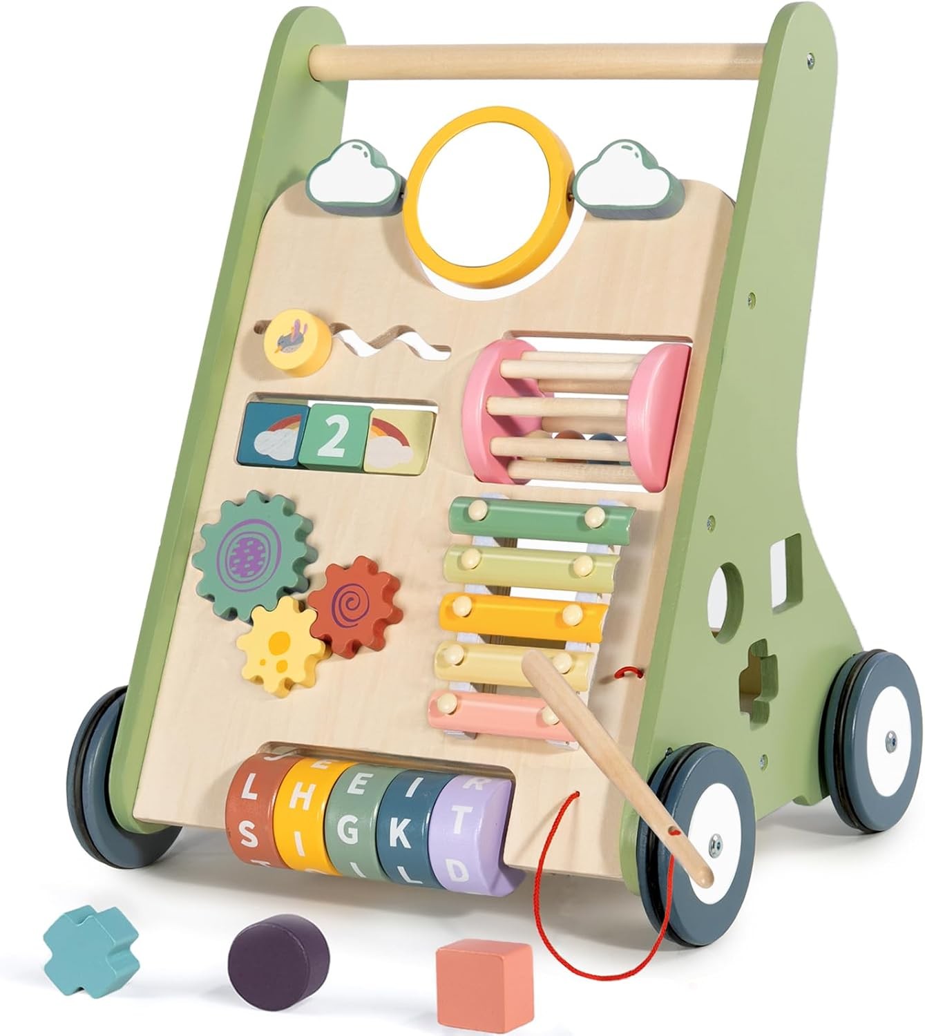 LOL-FUN Wooden Baby Walker for 1 Year Olds Boys Girls, Push Along Walkers with Detachable Busy Board, Walking Toys for Babies Gift Age 12 Months