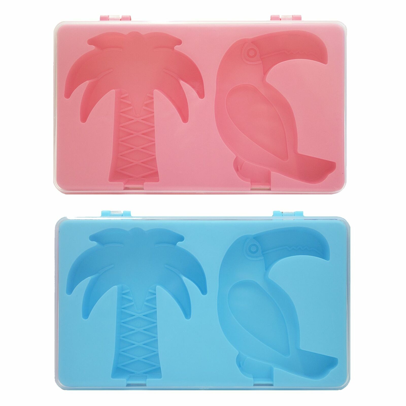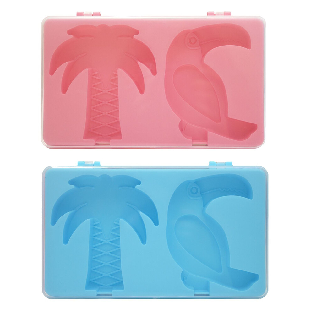 2 x Ice Lolly Maker Set Reusable Sticks Lid Palm Tree Toucan Mould Pink Blue