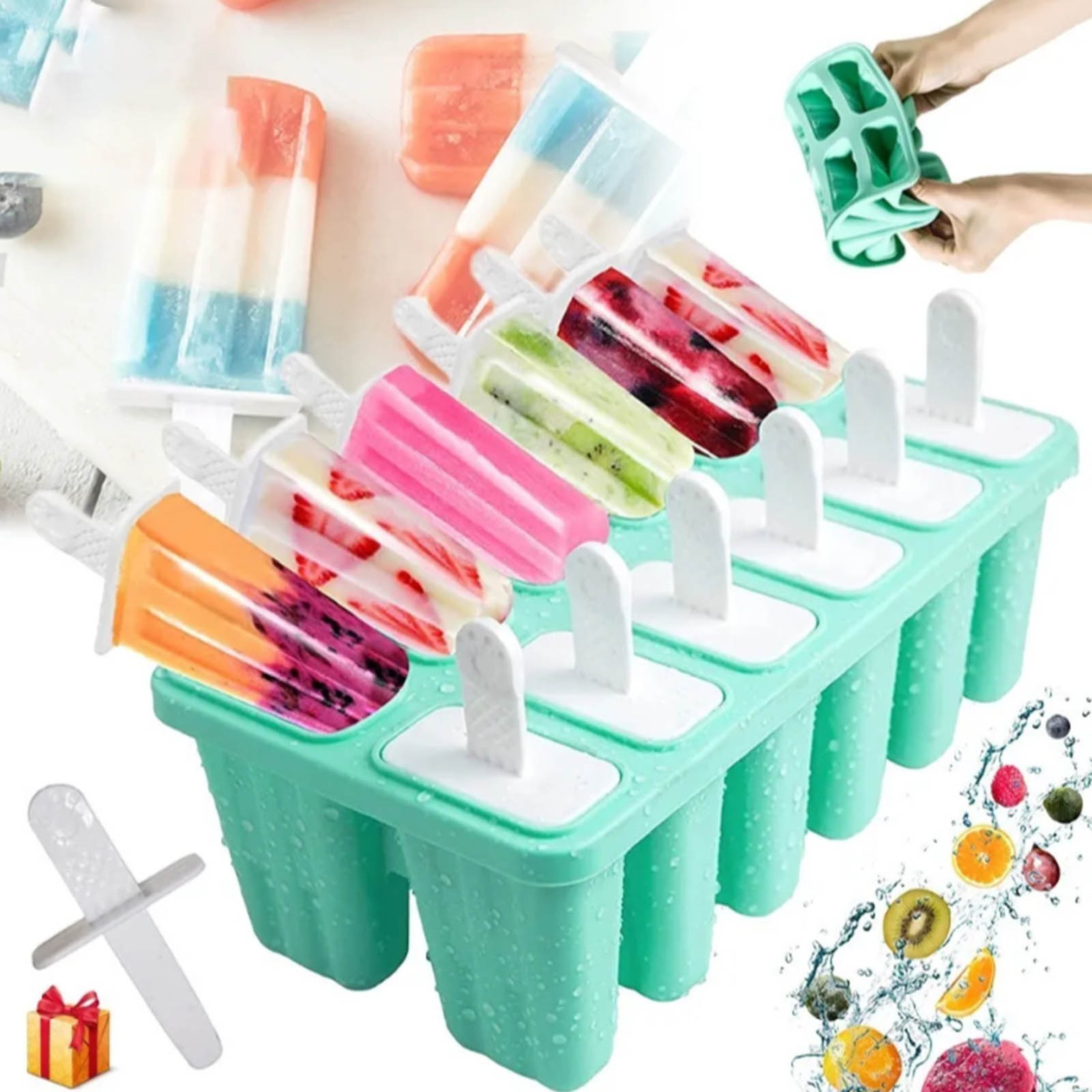 Ice Cream Mould 10 Grids Food Grade Silicone Non Stick Green Ice Lolly Maker SET
