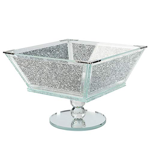 London Boutique Crystal Extra Large Fruit Bowl Centre Piece Storage Sparkle Crushed Diamond Filled Silver Metal Frame Square Shape 7.5 Inches Height