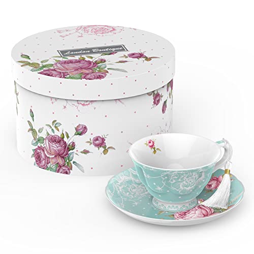 London Boutique Tea Cup and Saucer Set 1 Afternoon Tea Set New Bone China Vintage Flora Gift Box 200m (Turquoise)