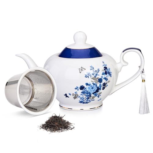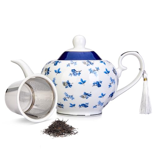 Teapot, London Boutique Large Teapots for 4 China Teapot Vintage Floral in Gift Box (Teapot Rose Blue)