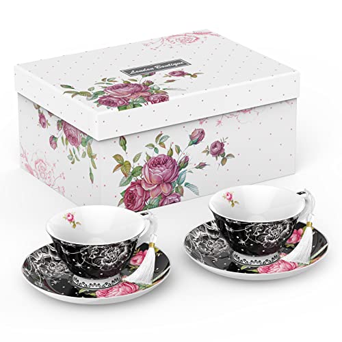 London Boutique Tea Cup and Saucer Set 2 Afternoon Tea Set New Bone China Vintage Flora Gift Box 200m (Black)