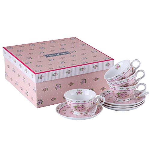London Boutique Tea cup and Saucer set 4 Afternoon Tea Set Shabby Chic Vintage New Bone China Porcelain Rose Flora Gift (Rose Pink)