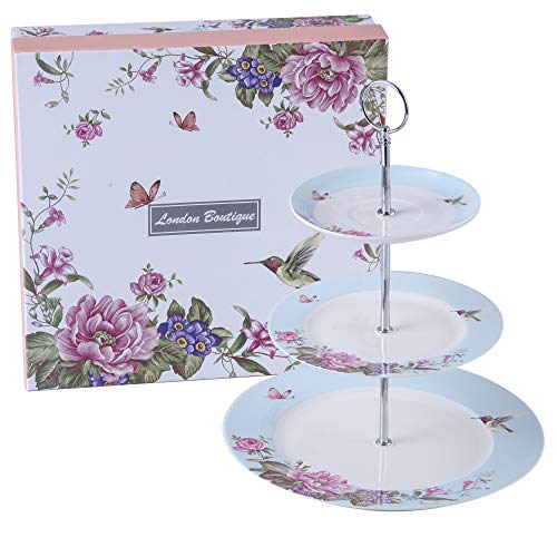 London Boutique Cake Stand afternoon tea stands 3 tier cake stand Vintage Bird Rose Butterfly New Bone China Serving Plate for Tea Party High tea Gift for Her (Blue)